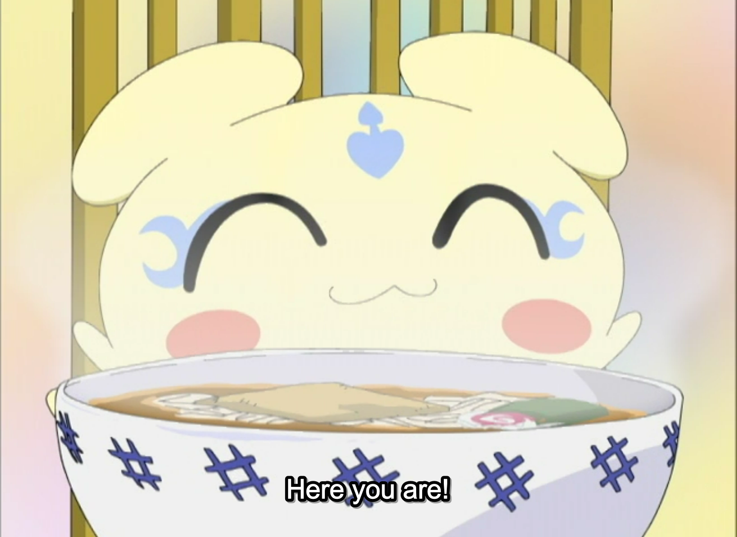 After a brief recap of the previous episode, we catch Nagisa (Natalie in English) sleeping in her bed, only to be awoken by her mascot alien cell phone named Mepple, demanding that she feed him. When Nagisa slides a card to feed him, Mepple demands he be served a bowl of kitsune udon. This moment is the first of our major localization changes in the English dub, wherein instead of udon, Mepple insists upon consuming a bowl of chicken noodle soup. Great start there.