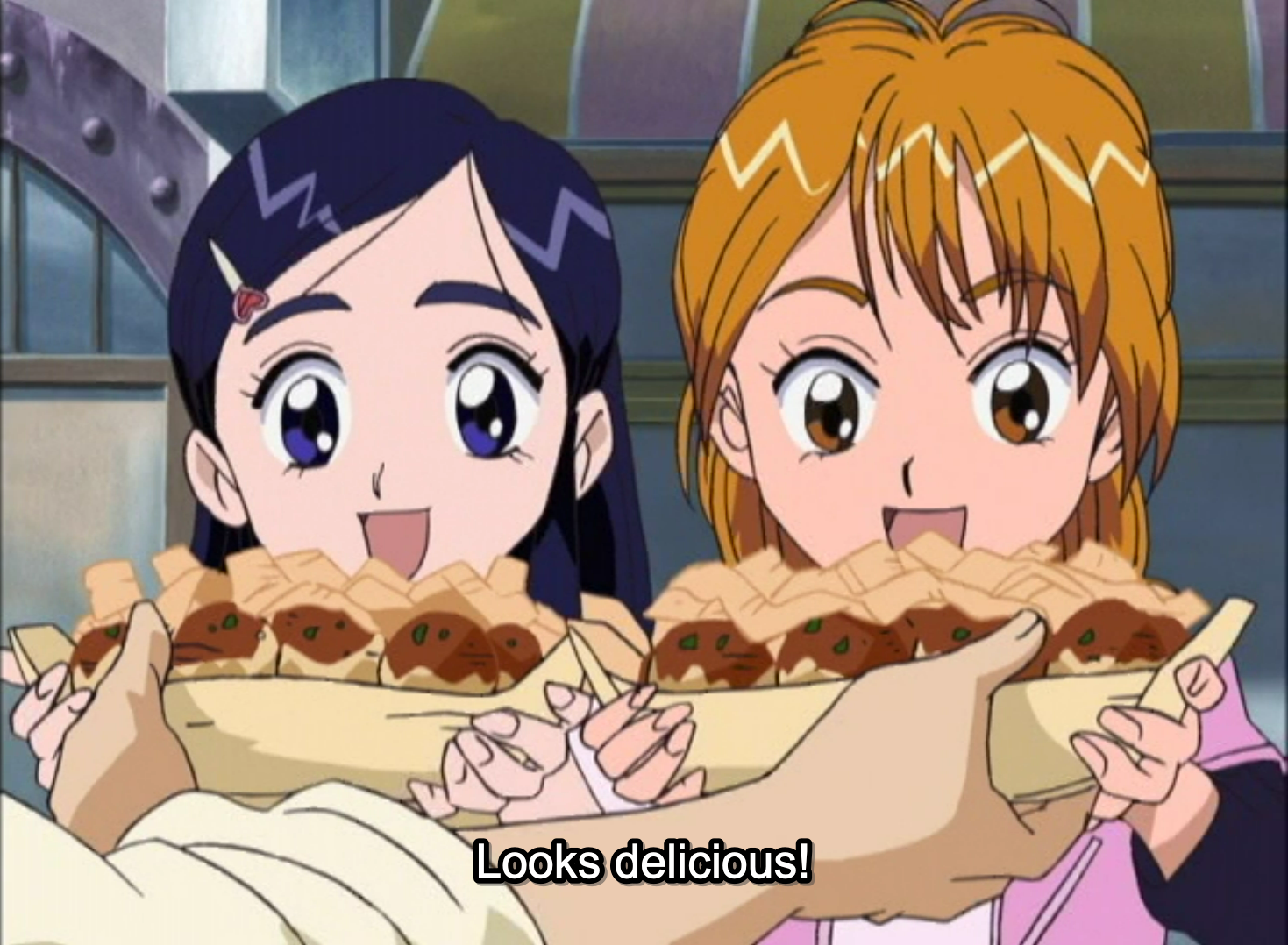Nagisa and Honoka take a walk around town and are starting to get hungry. To show how different the girls are from each other, each one makes several different kinds of food suggestions, all wildly different from each other. This is yet another localization moment for the English dub, wherein the localization team decided all of the food items needed to be more westernized. Taiyaki became cake. Yakisoba became spaghetti. I'm a little confused at why pasta became stroganoff, but maybe that's because they wrote themselves into a corner with spaghetti just seconds earlier. Okonomiyaki became stir-fry. Nabeyaki udon became pita wraps. That one was pretty damn bad, but the most egregious of all was the two of them walking up to a takoyaki stand owned and operated by a friend of Nagisa's, only to have the English dub make the wild claim that these were donuts. This is 4Kids Pokemon levels of rice-ball-to-donut localization here. In the first five episodes, it's easily the most eye-rolling localization choice, and it's the kind of decision that has made internet chuds mad about even the thought of localization ruining anime for over 20 years.