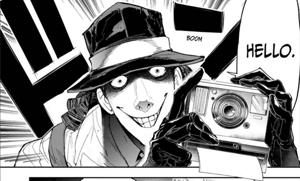 The manga opens on some panels of a young boy named Sota who is clearly playing on a Nintendo Switch, possibly getting in a round of Fortnite. His mom indicates that he's been missing quite a bit of school. That's when he gets a knock at the door from his new next door neighbor—the titular character of Saburo Kono. Saburo is a bit eccentric and even seems kinda frightening in a way. His face is in something of a permanent Joker smile, with puffy ringed hair spilling out from underneath a wide-brimmed hat. He tells the boy he's a photographer, and while he claims he's a photographer of the "normal" variety, he tells Sota that he's been trying to take a picture of the spirit of a ghost haunting the apartment he's just moved into but has not yet managed to do it successfully.