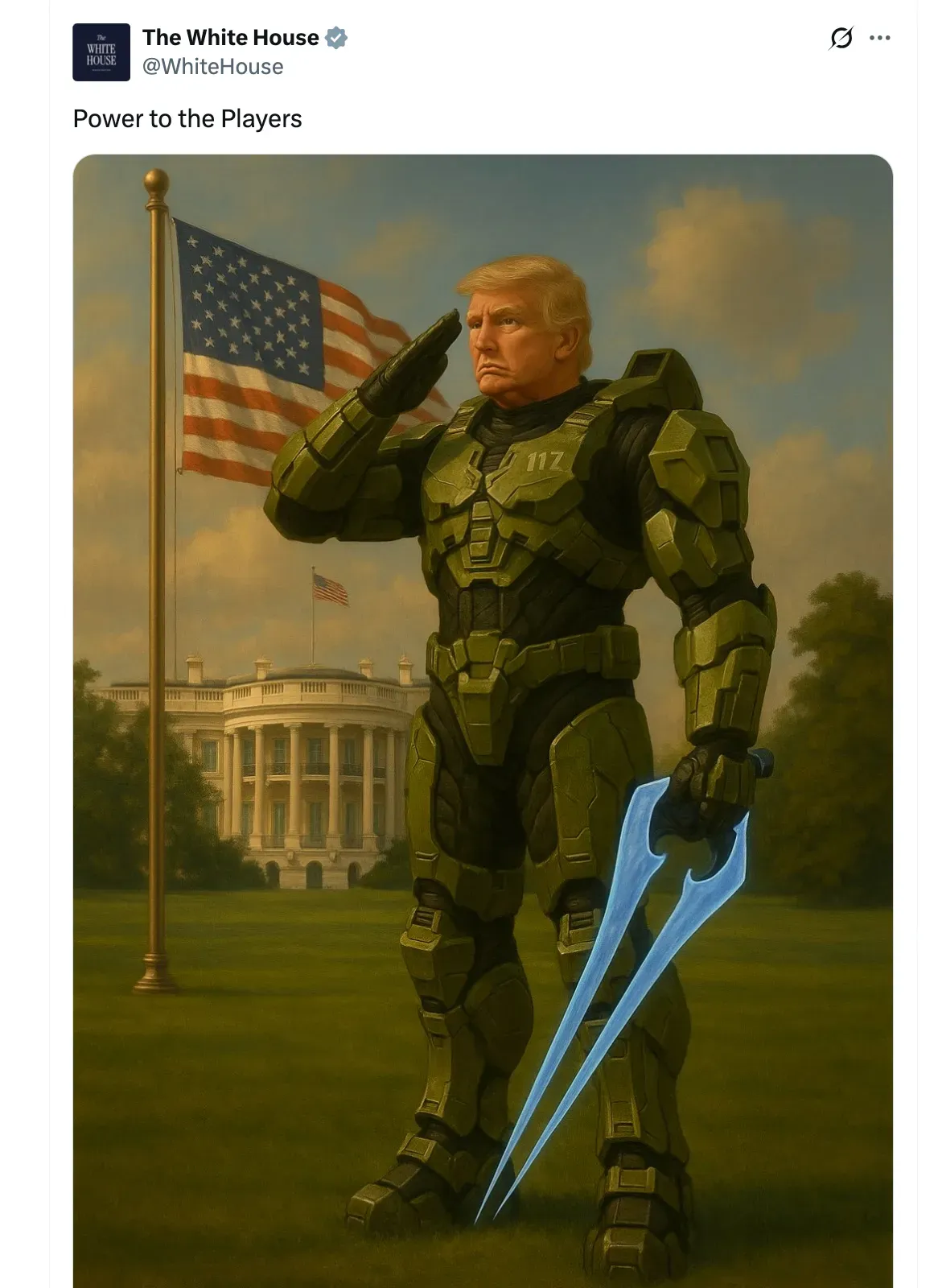 In October 2025, the White House Twitter account posted an AI-generated image of Donald Trump standing on the White House lawn, dressed in Spartan armor, saluting the American flag with his right hand, and holding an Energy Sword in his left.