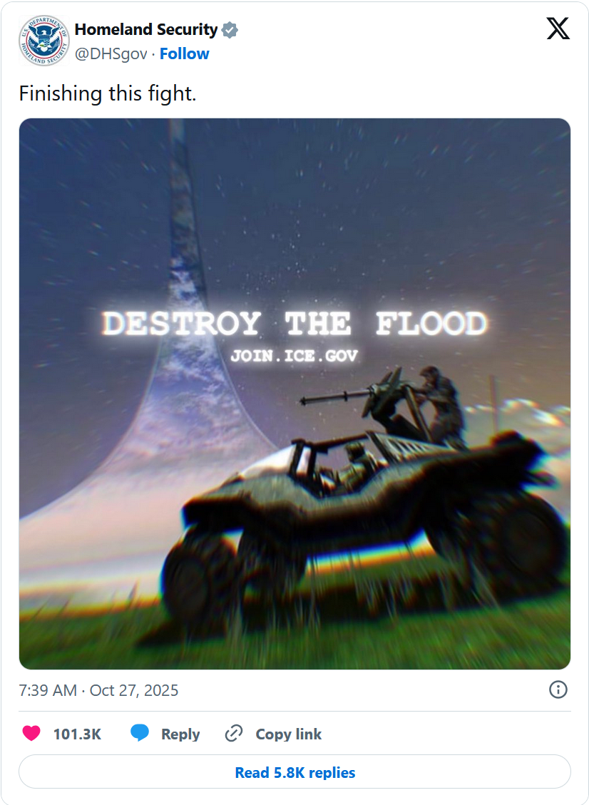 The next day, the Twitter account of the US Department of Homeland Security posted a tweet using Halo imagery to encourage its followers to join Immigration and Customs Enforcement (or ICE). "Destroy the Flood. Join ICE."